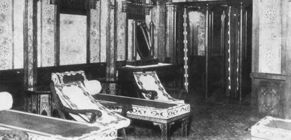 NOTE: We have passenger Frank Browne to thank for many of the pictures taken here of rooms in the Titanic that show people using them.